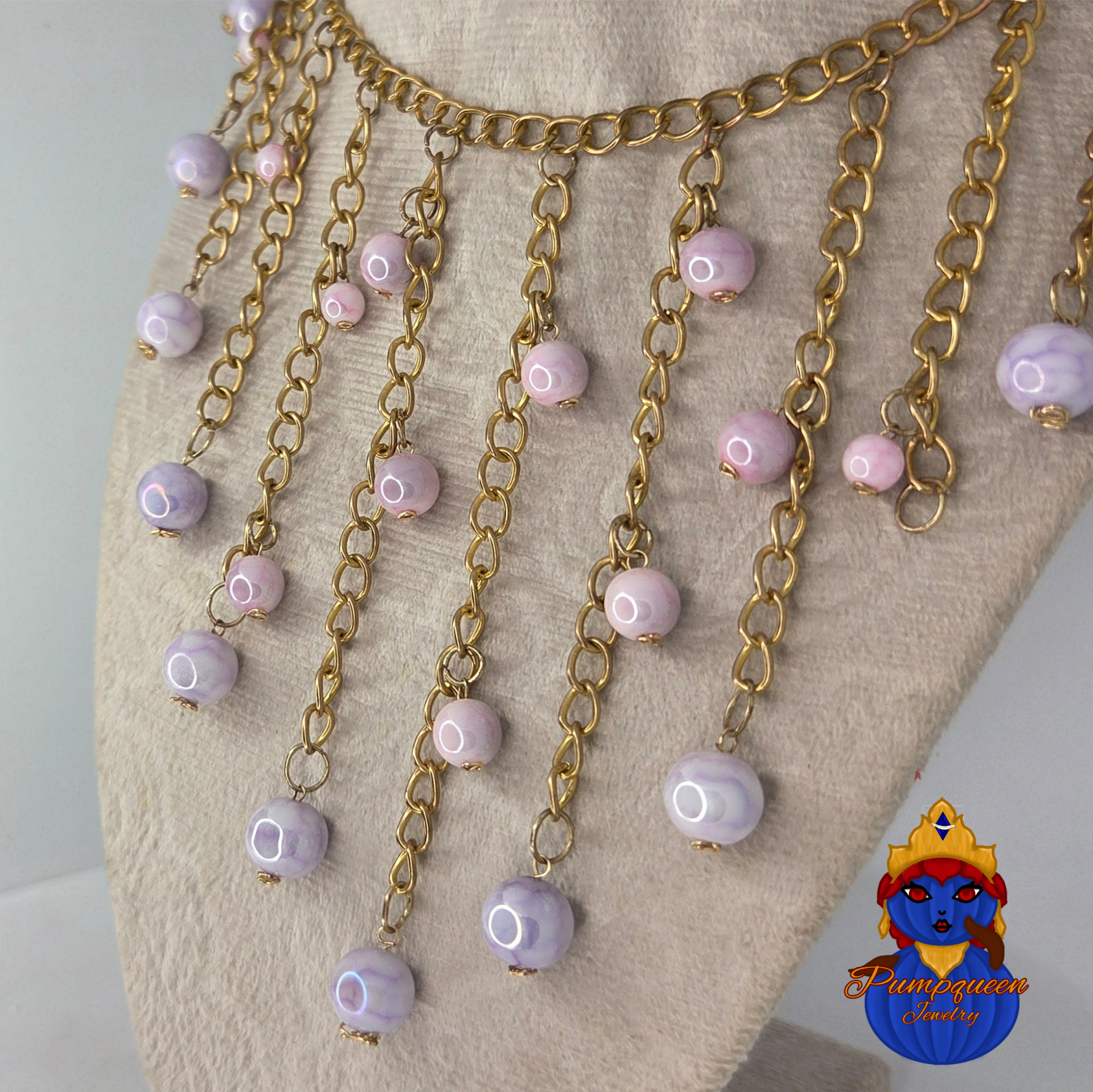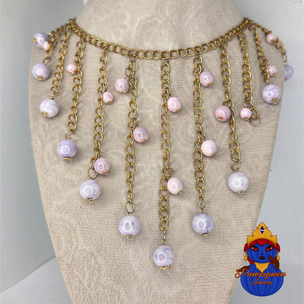 With soft lavender beads cascading on golden chains, this whimsical necklace and matching earrings add a touch of dreamy charm to any look. Perfect for every occasion.